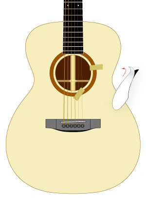 Lege das Pickguard auf die gewünschte Stelle der Gitarrendecke und entfernen noch nicht die Schutzfolie auf der Rückseite. Richte es wie in Zeichnung 1 gezeigt an der Schalllochverzierung und in der Längsrichtung der Gitarrendecke aus.