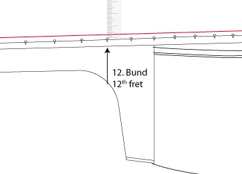 Die Saiten sollen im richtigen Abstand über dem erste Bundstäbchen sein. Um dies festzustellen, drücke nacheinander jede einzelne Saite mit dem Ringfinger am dritten Bundstäbchen auf um dann gleichzeitig mit dem Zeigefinger die Saite vor dem ersten Bundstäbchen leicht anzutippen. Dabei achte auf die Lücke zwischen Saite und Bundstäbchen (Zeichnung). Diese Lücke sollte der Stärke einer Visitenkarte entsprechen.