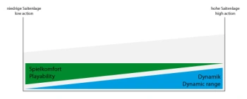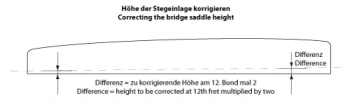 Die Stegeinlage kann in der Höhe variiert werden, um die Saitenlage zu bestimmen, siehe Saitenlage messen und einstellen im FAQ Bereich.